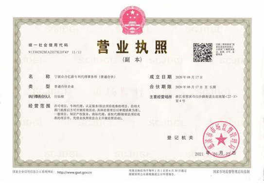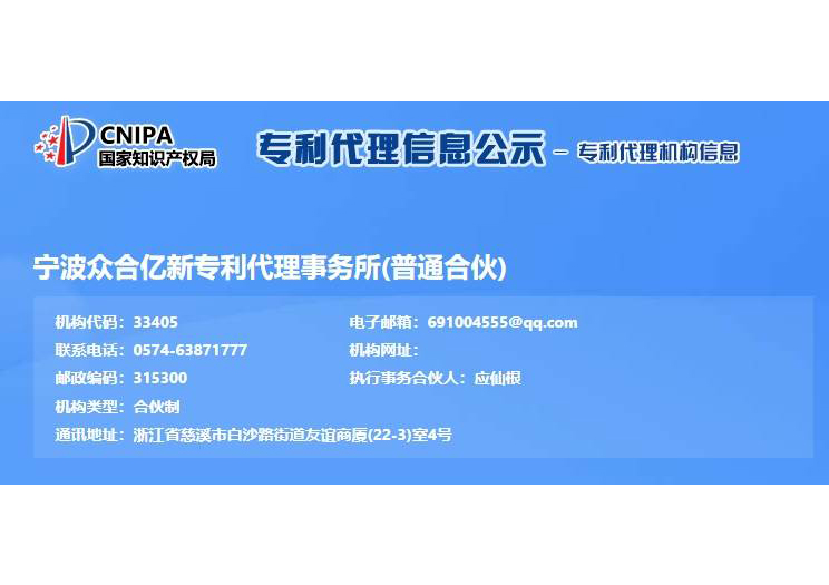浙江億新知識產權服務有限公司前身為慈溪眾合知識產權代理事務所,創(chuàng)始于2004年,為了服務更多的創(chuàng)新企業(yè),實現“服務億萬創(chuàng)新企業(yè)”的理念,后更名為浙江億新知識產權,旗下公司包括:寧波眾合億新專利代理事務所(機構代碼33405)、中范(北京)認證有限公司。其中寧波眾合億新專利代理事務所是慈溪市科技服務聯(lián)盟理事單位,前灣區(qū)知識產權工作站。公司位于浙江省慈溪市文化商務區(qū)友誼商廈,并在北京、青島設有辦事處。
